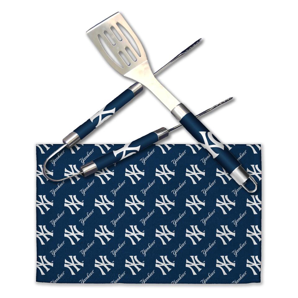 Flip your burgers and grab the sides with an Officially Licensed MLB 3-Piece BBQ Utensil Set by TheNorthwest. This set includes one 16″ spatula, one 16″ tongs and one 11″x 18″ towel. Each item features your favorite baseball team’s logo on a solid background on the grip. The towel features a repeating print of team name and logos. Hang this Stainless Steel set on your grill to let everyone know who’s the boss of the barbeque.